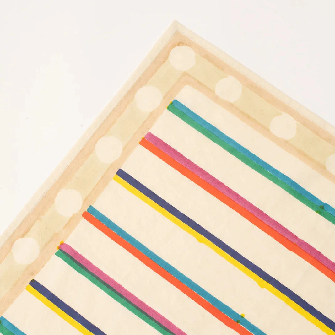 Block printing is an artisanal technique that accentuates the "colouring" effect, giving the item an imperfect look. Pieces are illustrated with patterns drawn in three ranges of bright colours by Table's Caroline and Alice in their Marseille workshop. The designs are inspired by elementary geometric shapes: stripes, checks and polka dots.